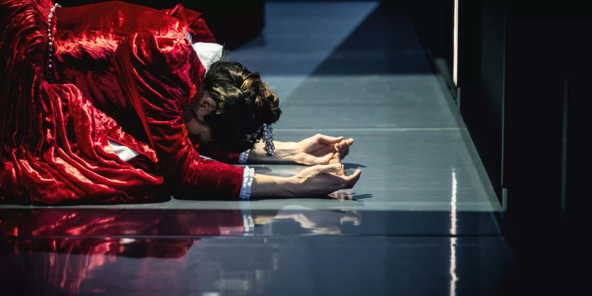 Et c’est exactement ce que souligne la mise en scène de Chloé Dabert. Sans chichi. Style suisse. Less is more. Efficace, rigoureux, presque pauvre. Le même plateau tout du long : une cage de verre, des panneaux qui montent et descendent, comme un écrin, comme une vitrine de musée. Un espace qui expose autant qu’il enferme. Qui impose une distance, des circulations alambiquées, une géométrie contraignante. On observe les corps comme des pièces rares, sous verre, déjà un peu mortes. Le dispositif dit clairement : ici, on regarde des figures prises au piège d’un système, pas des héroïnes romanesques.